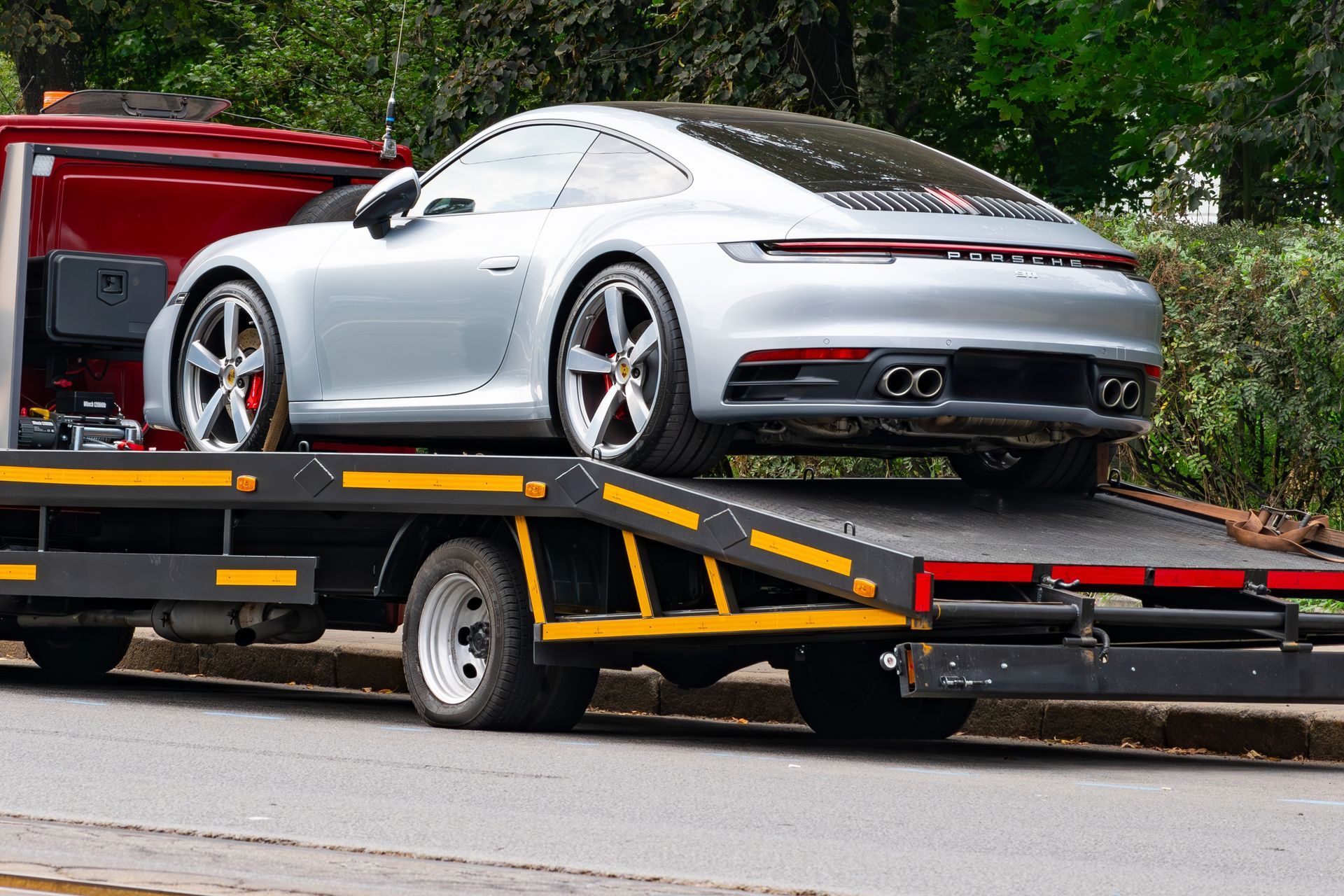When you schedule transport for a high-value vehicle, the operator uses a flatbed with a low-angle hydraulic tilt to reduce the incline during loading. You will see the vehicle rolled or winched onto the bed slowly, with attention given to avoiding contact between the undercarriage and the ramp edge. Soft tie-down straps are attached to the wheels or designated anchor points, not to suspension components or body panels.